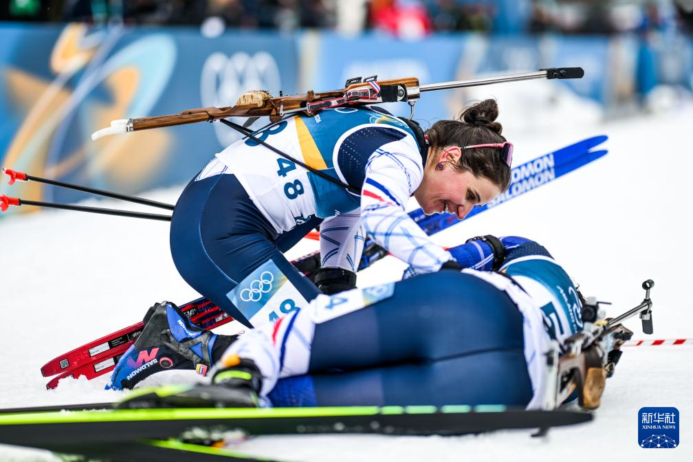 2月11日,法国选手西蒙(下)在比赛中冲线后与教练庆祝。她获得冠军。
