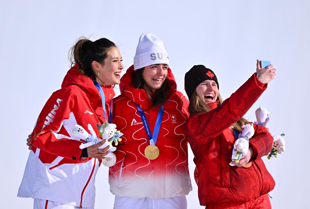 2月9日,亚军中国选手谷爱凌(左)和冠军瑞士选手玛蒂尔德·格雷莫德(中)、季军加拿大选手奥尔德姆在领奖台上合影。新华社记者 张宏祥 摄