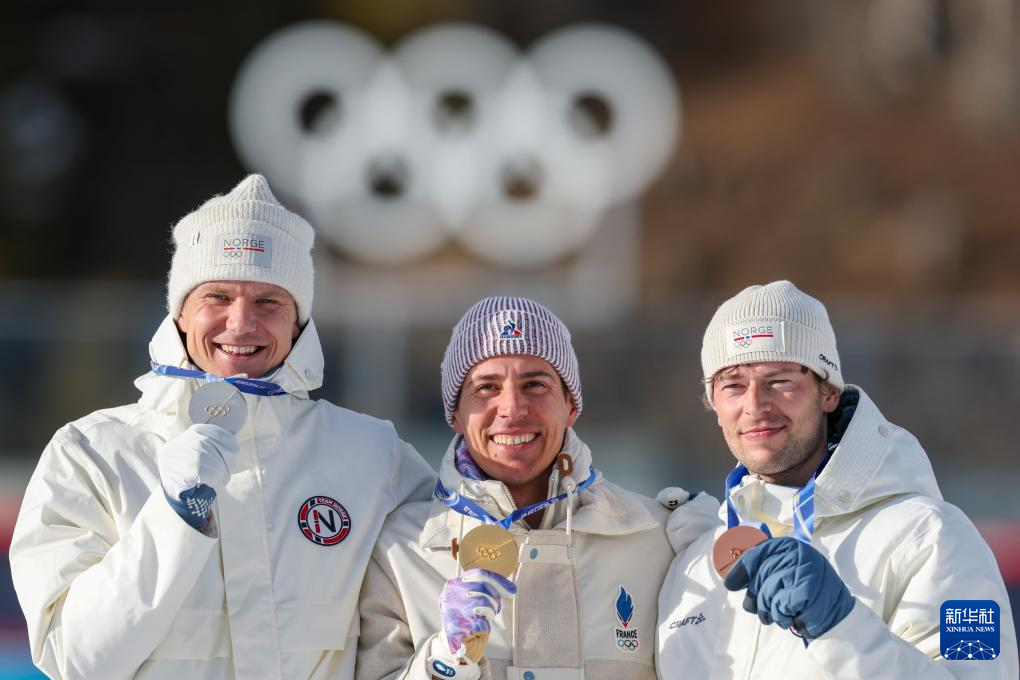 2月13日,亚军挪威选手韦特勒·肖斯塔·克里斯蒂安森、冠军法国选手康坦·菲永·马耶、挪威选手斯图拉·霍尔姆·莱格雷德(从左至右)在颁奖仪式上合影。