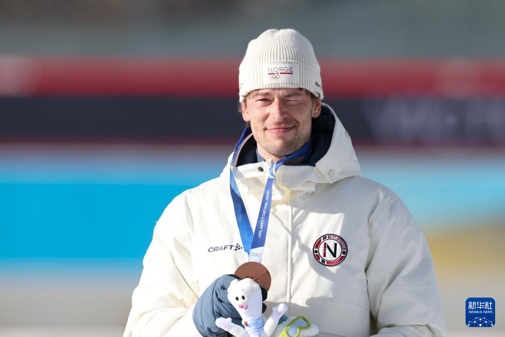 2月13日,亚军挪威选手韦特勒·肖斯塔·克里斯蒂安森在颁奖仪式上庆祝。
