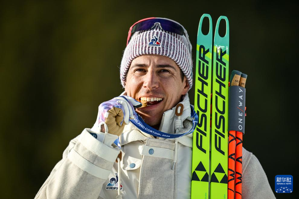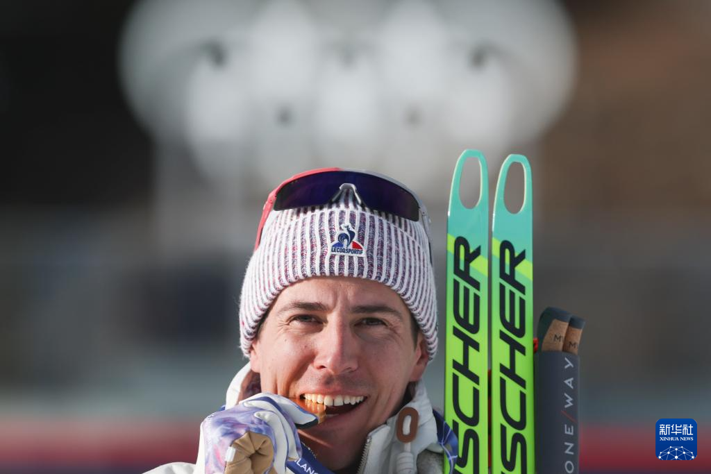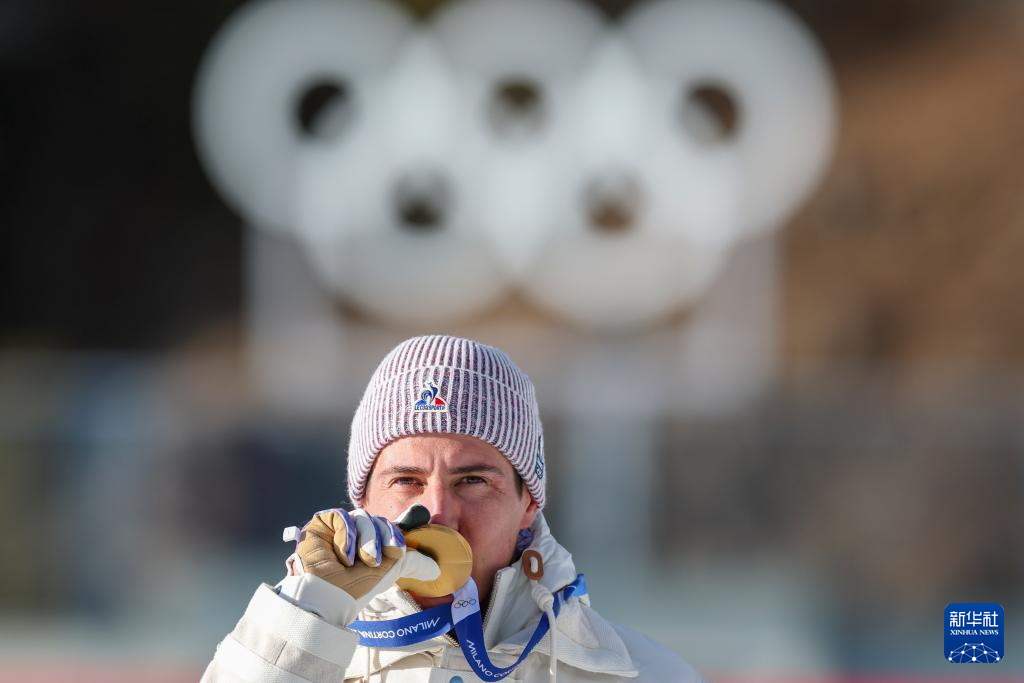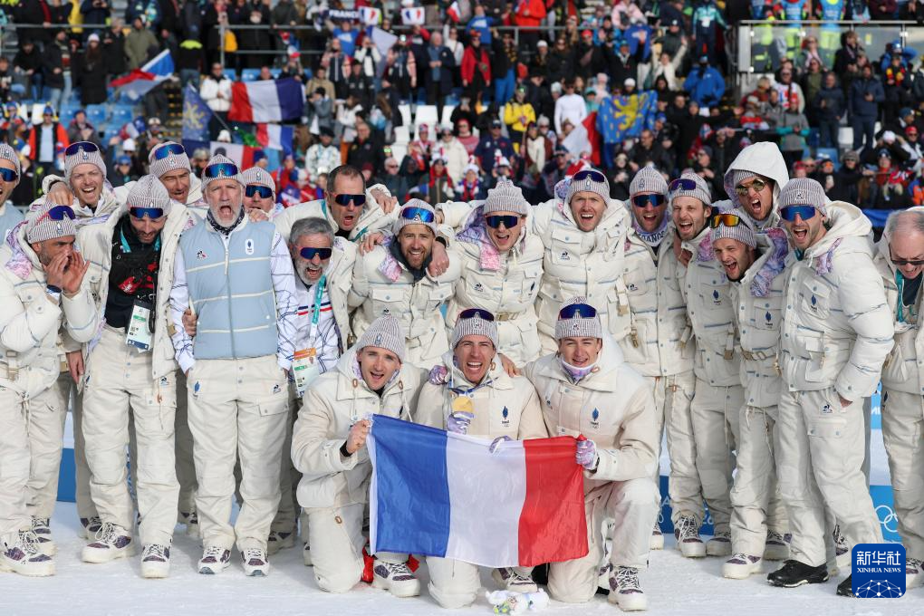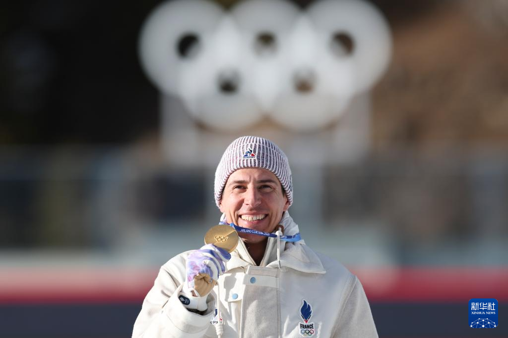 2月13日,冠军法国选手康坦·菲永·马耶在颁奖仪式上庆祝。