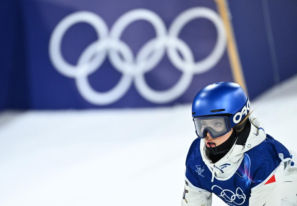 在北京2022年冬奥会自由式滑雪女子坡面障碍技巧资格赛中,中国选手谷爱凌在等待裁判打分时吃韭菜盒子。新华社记者 郭程 摄