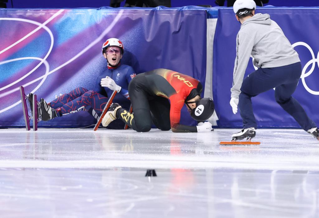 荷兰队、韩国队、拉脱维亚队的支持者为率先冲线的选手们欢呼着。与此同时,未能完赛的中国选手孙龙被医务人员围在场边一角;而他的队友刘少昂则在冰面上沉默地完成比赛。