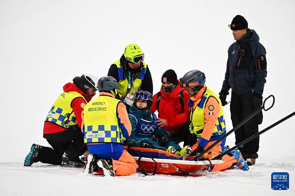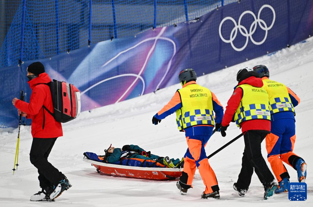 2月16日,瑞士选手玛蒂尔德·格雷莫德(中)在赛前训练摔倒后接受医疗团队的帮助。