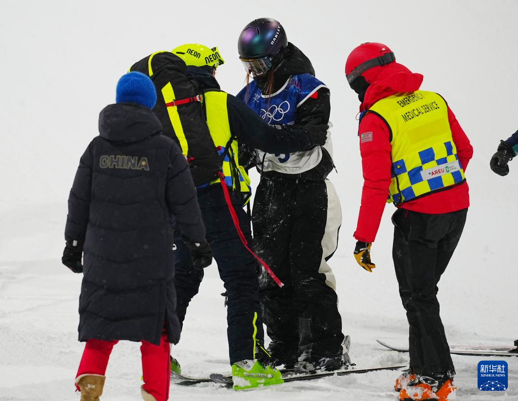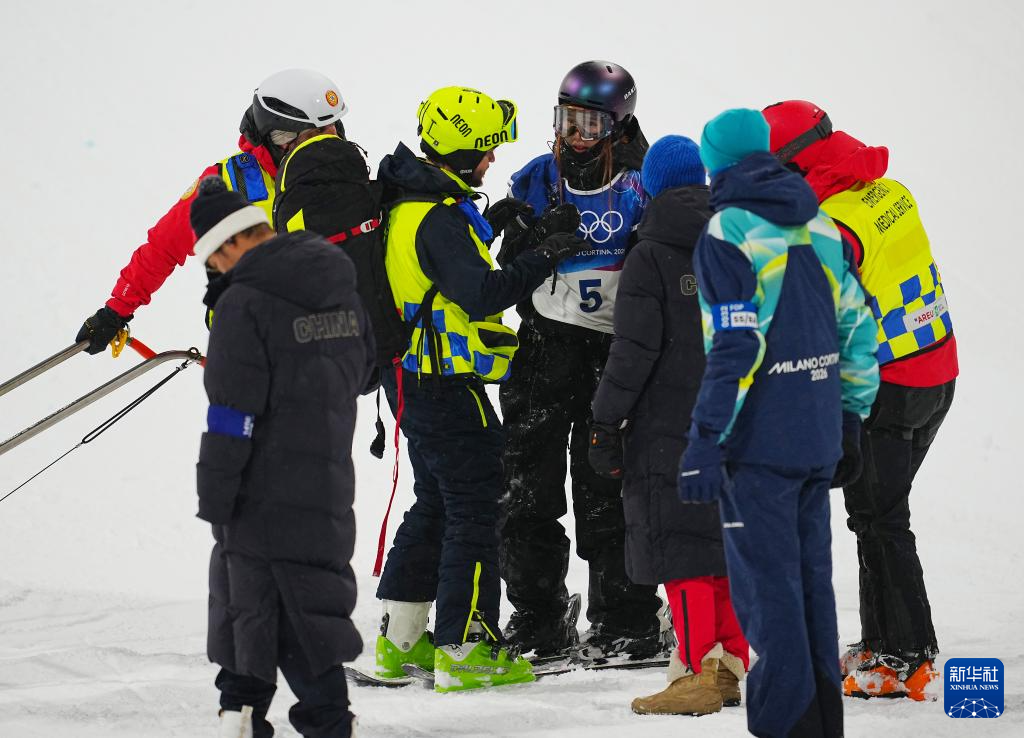 2月16日,中国选手刘梦婷(中)在赛前训练摔倒后接受医疗团队的帮助。