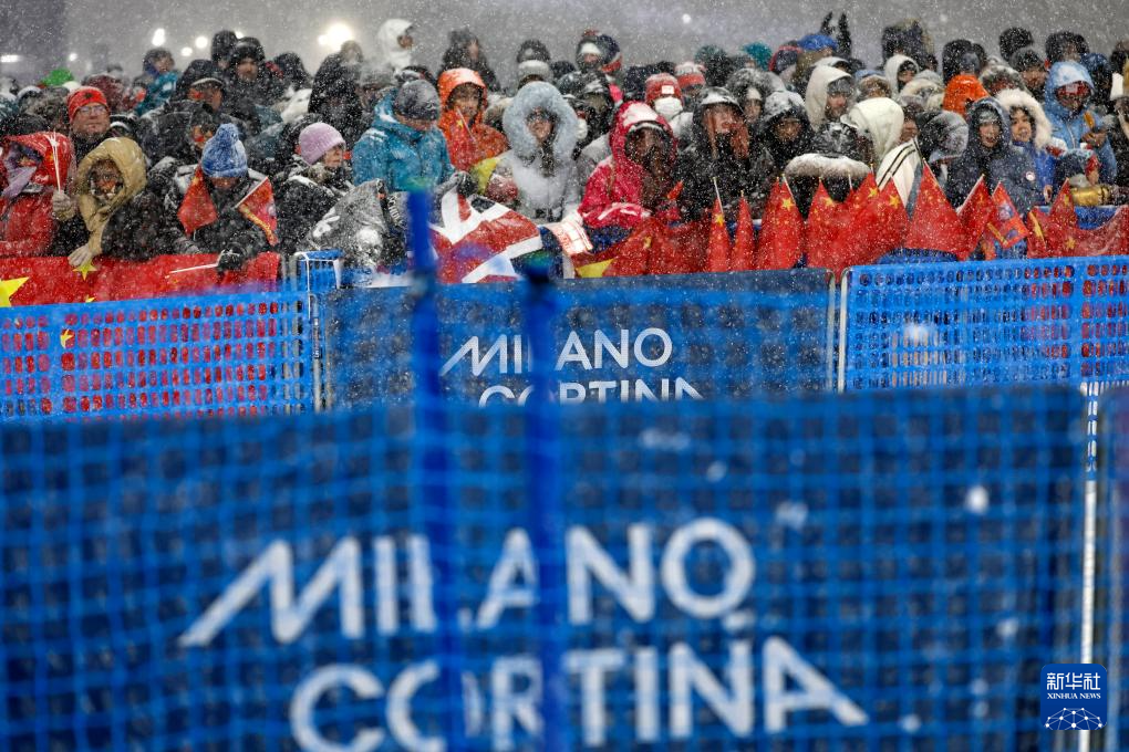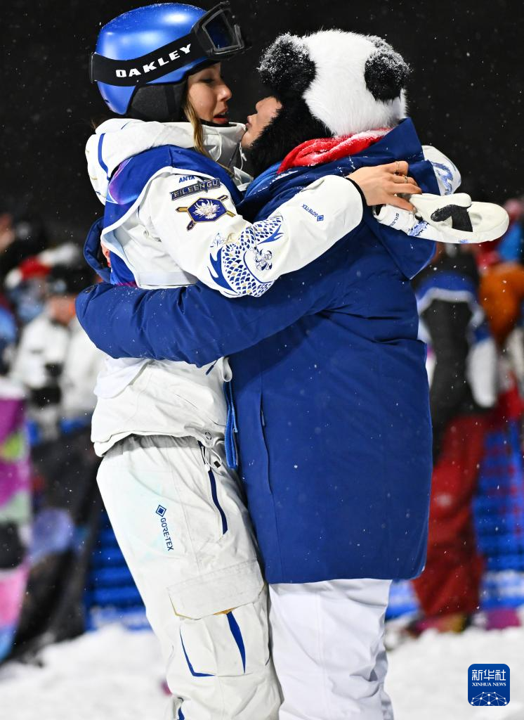 2月16日,中国选手谷爱凌(前)在第三跳后与观众拥抱。她获得亚军。