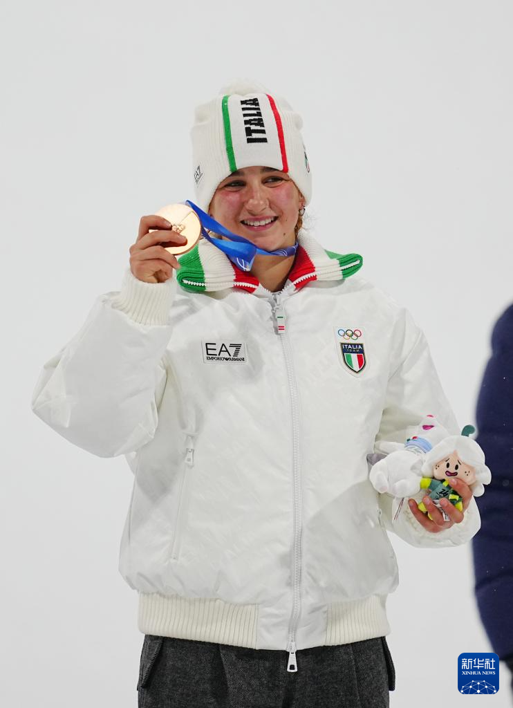 2月16日,季军意大利选手弗洛拉·塔巴内利在颁奖仪式上展示奖牌。