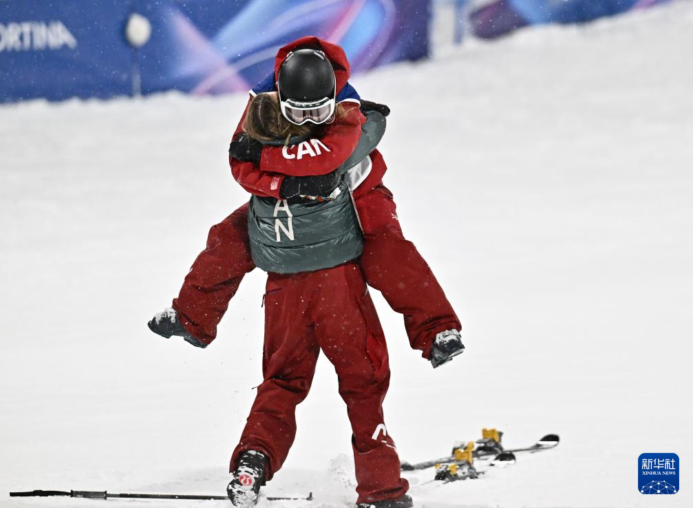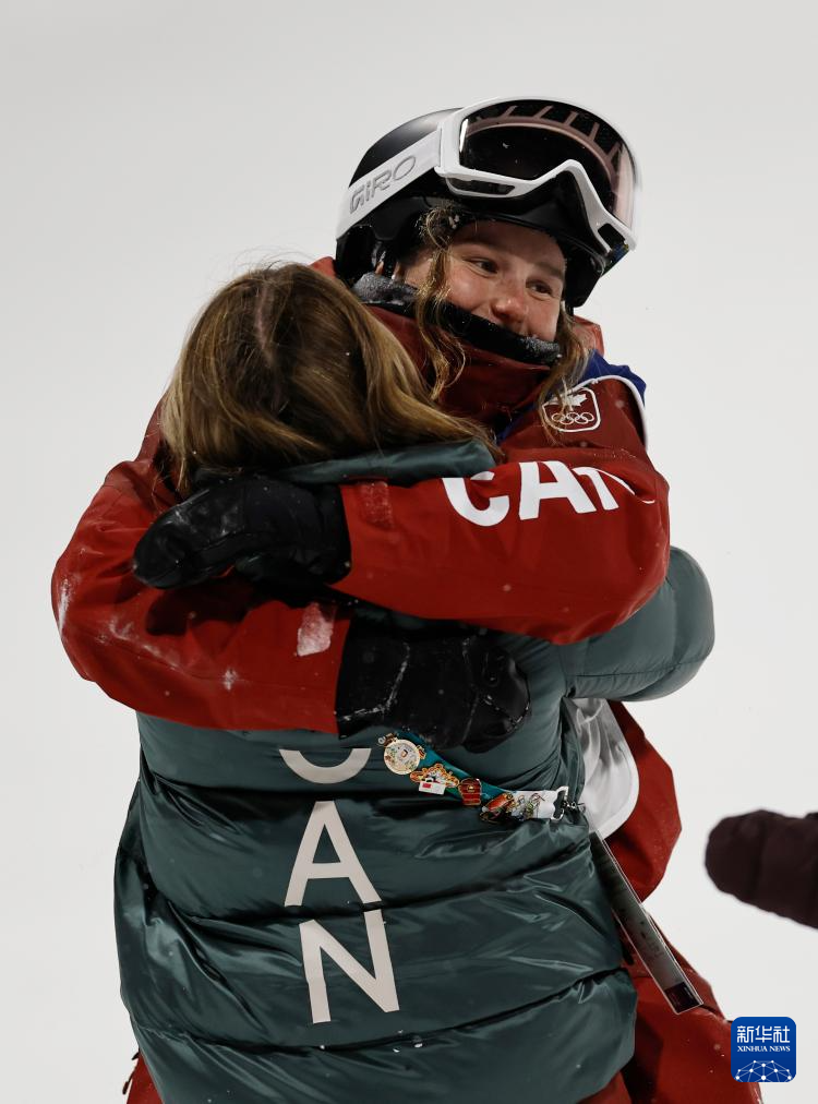 2月16日,加拿大选手梅根·奥尔德姆(右)在比赛后拥抱队友。她获得冠军。
