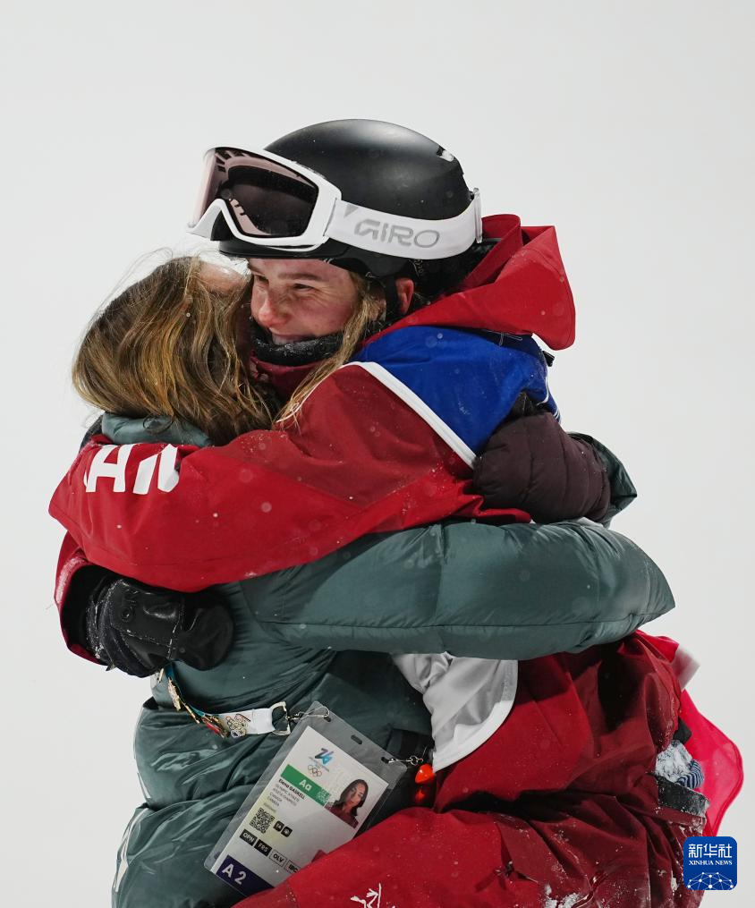 2月16日,加拿大选手梅根·奥尔德姆(右前)在赛后与中国选手谷爱凌(右后)拥抱。她们分获冠、亚军。