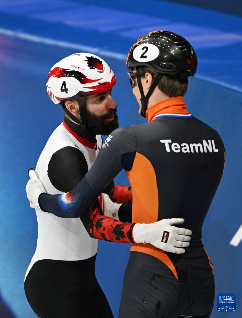 2月18日,荷兰选手梅勒·范特·沃特(右)和加拿大队选手史蒂文·杜博伊斯赛后拥抱。