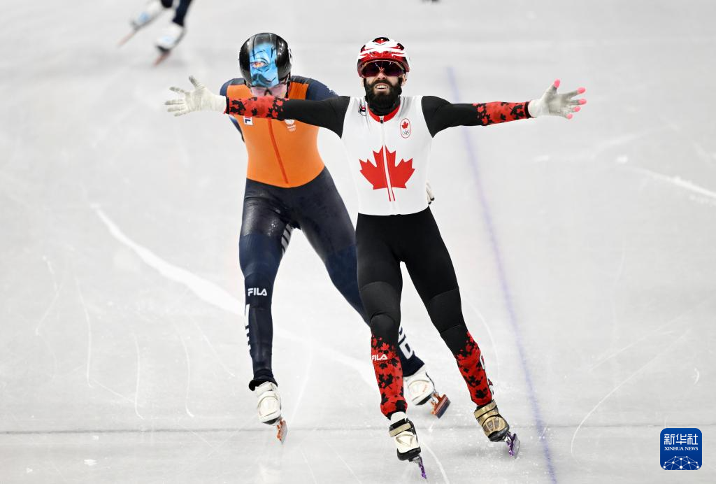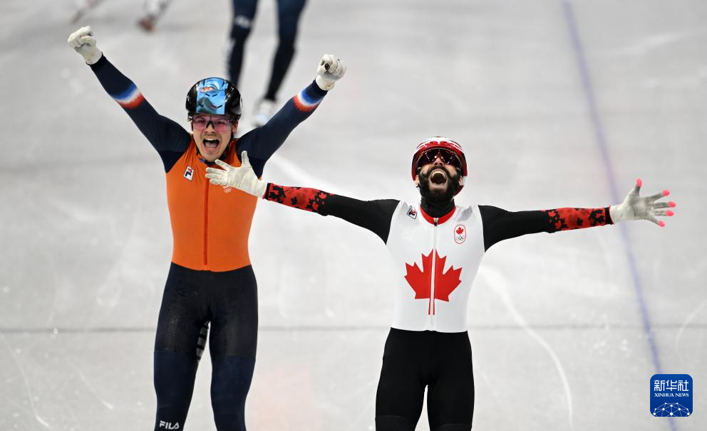 2月18日,加拿大队选手史蒂文·杜博伊斯(右)在比赛中率先冲线后庆祝。