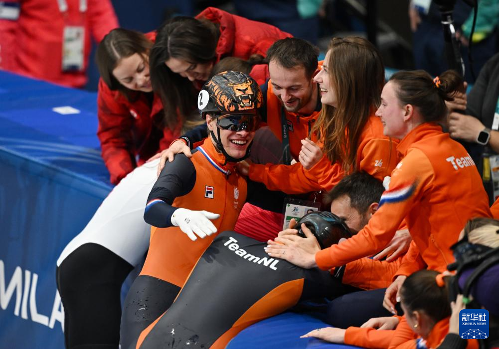 2月18日,荷兰选手梅勒·范特·沃特和延斯·范特·沃特赛后与团队成员庆祝。