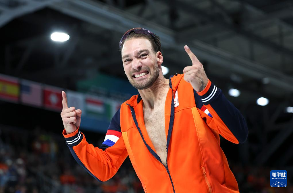 2月19日,荷兰选手凯尔·内斯在比赛后庆祝。他获得季军。