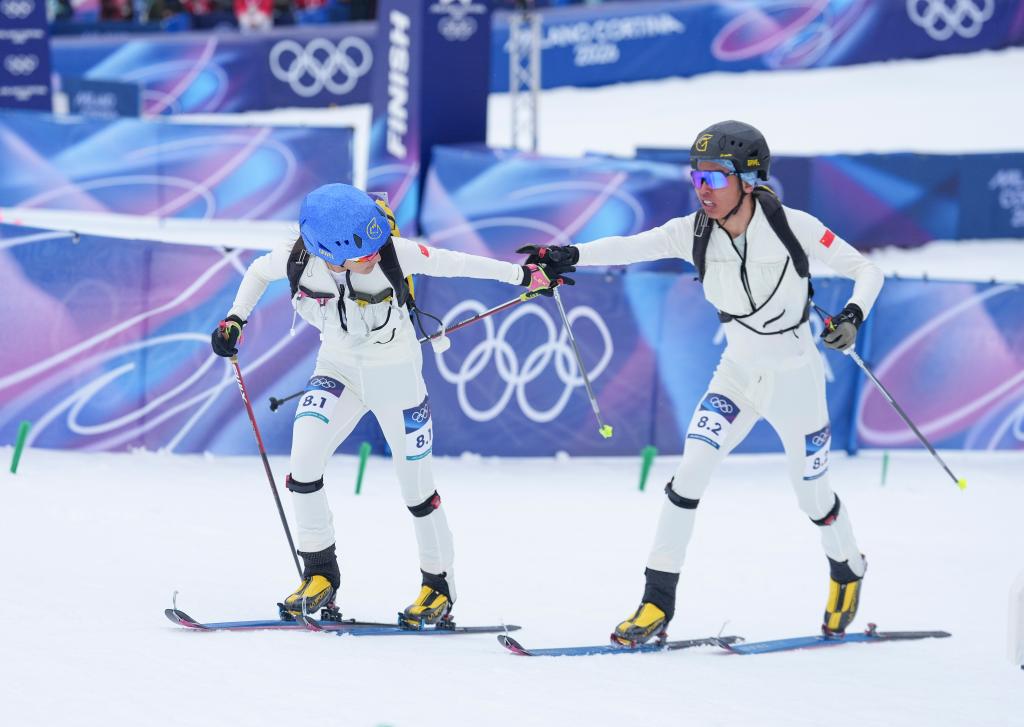 获得米兰-科尔蒂纳冬奥会滑雪登山混合接力比赛第八名的中国组合次旦玉珍(左)/布鲁尔在终点处合影(2026年2月21日摄)。新华社记者 胡虎虎 摄