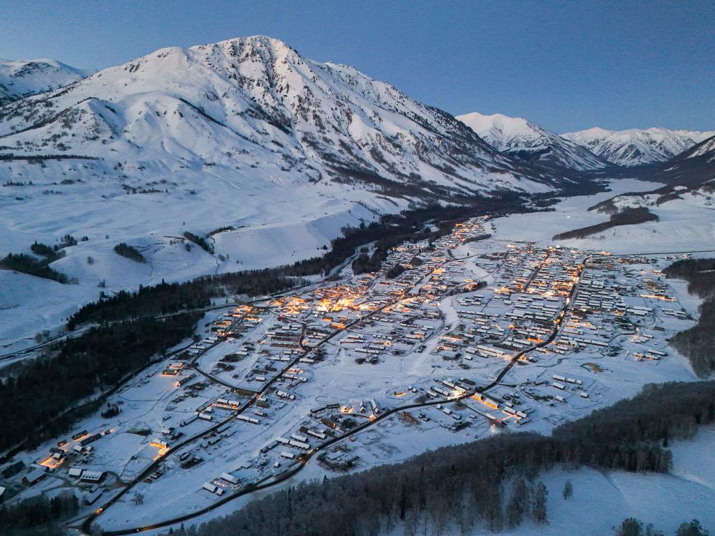 夜幕降临,新疆阿勒泰将军山国际滑雪度假区即将开启夜场运营(2025年1月24日摄,无人机照片)。新华社记者 胡虎虎 摄