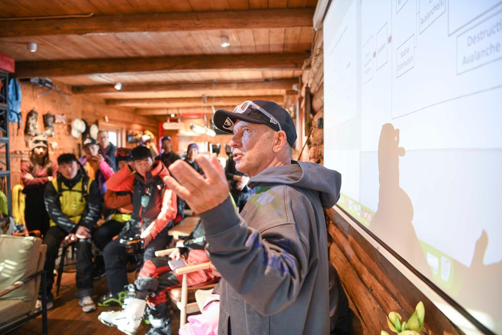 在新疆阿勒泰禾木吉克普林国际滑雪度假区,一名来自新西兰的滑雪专家向中外雪友分享雪崩风险管理等知识(2024年12月3日摄)。新华社记者 胡虎虎 摄