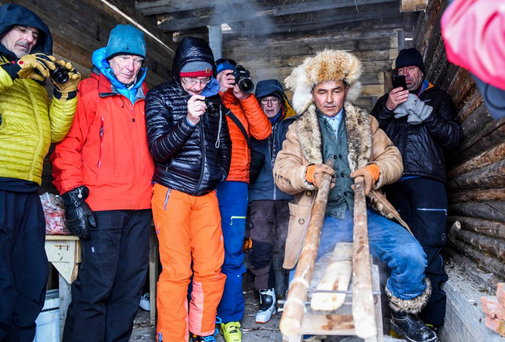 在新疆阿勒泰地区禾木村,来自欧洲的雪友观看牧民制作古老毛皮滑雪板(2019年1月10日摄)。新华社记者 胡虎虎 摄