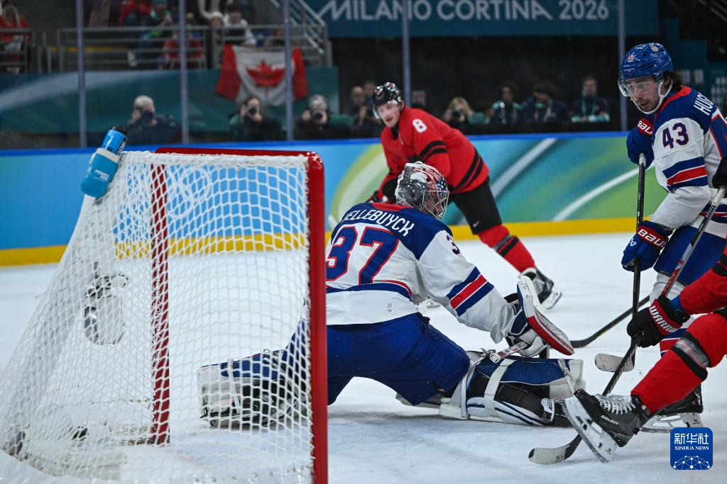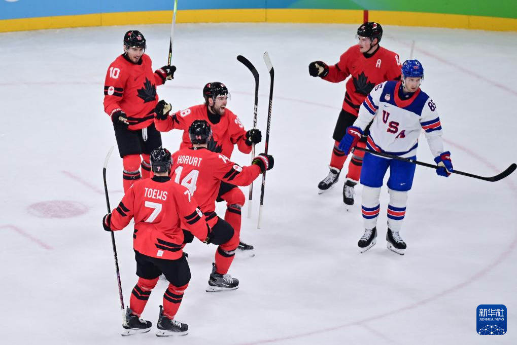 2月22日,加拿大队球员在比赛中庆祝进球。