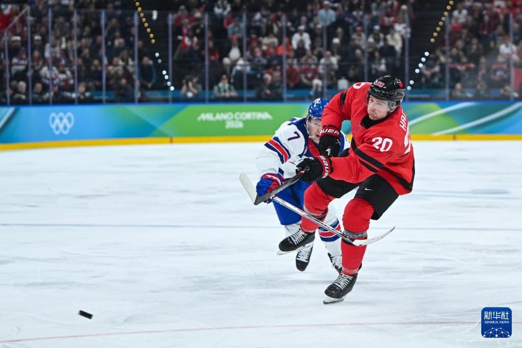 2月22日,加拿大队球员哈利(右)在比赛中射门。