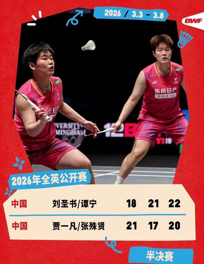 新华社北京3月8日电 当地时间7日,2026年全英羽毛球公开赛在伯明翰结束半决赛争夺。中国队在女单、女双两个项目中各锁定一个决赛席位。