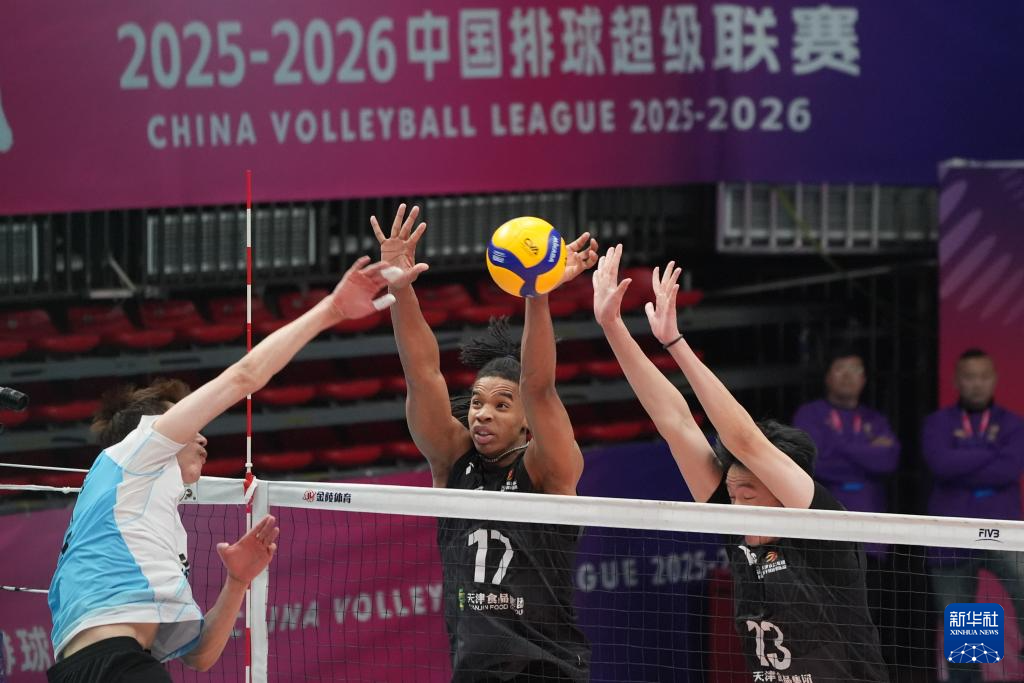 3月8日,天津食品集团队球员阿里汉德罗(中)、陈龙海(右)在比赛中拦网。