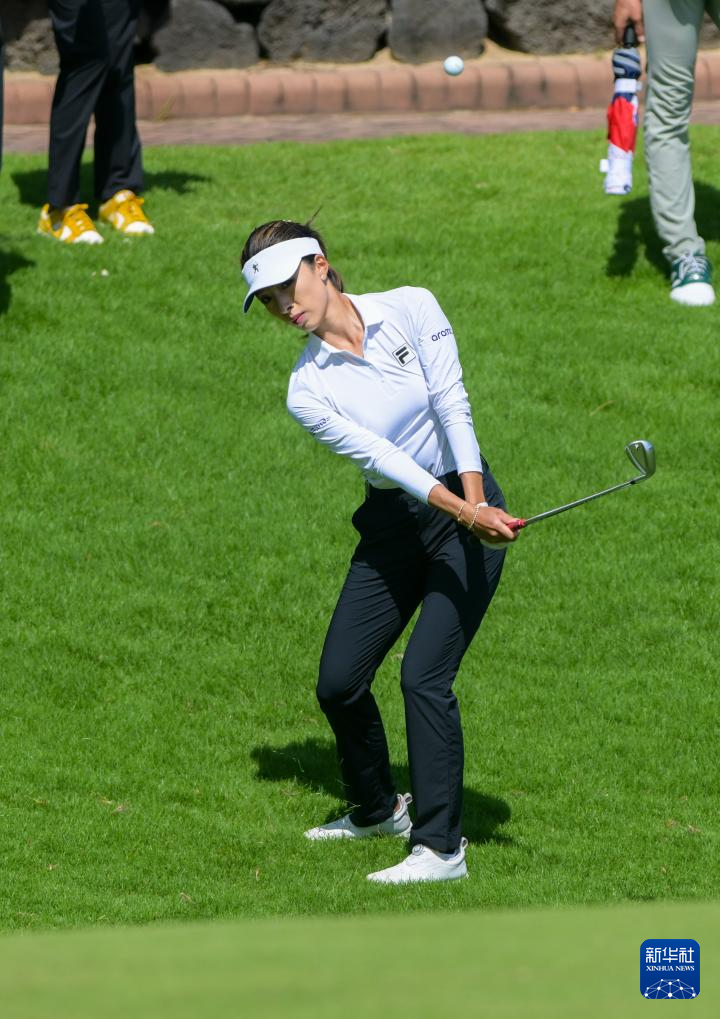3月8日,中国选手何沐妮在比赛中发球。最终,她以290杆、高于标准杆2杆的总成绩获得并列第28。