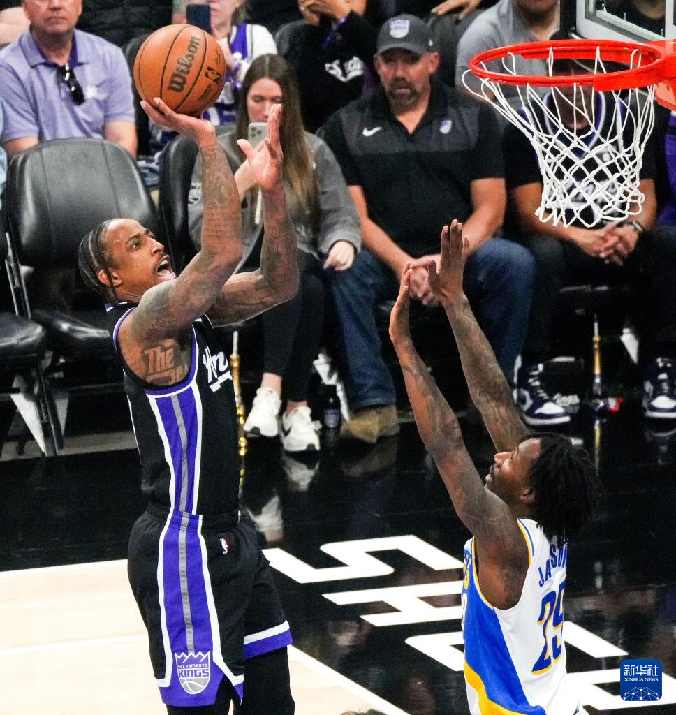 3月10日,国王队球员德罗赞(右)在比赛中封盖。