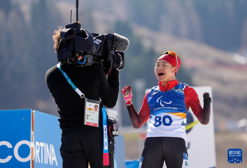 当地时间3月13日,在意大利泰塞罗举行的米兰-科尔蒂纳冬残奥会冬季两项男子短距离追逐(站姿)比赛中,中国选手蔡佳云夺得冠军。