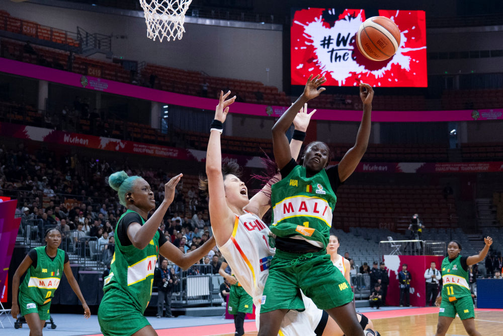 3月11日,中国队81:68战胜马里队。图为李月汝(前中)和马里队球员西索科(前右)在比赛中拼抢。新华社记者 伍志尊 摄