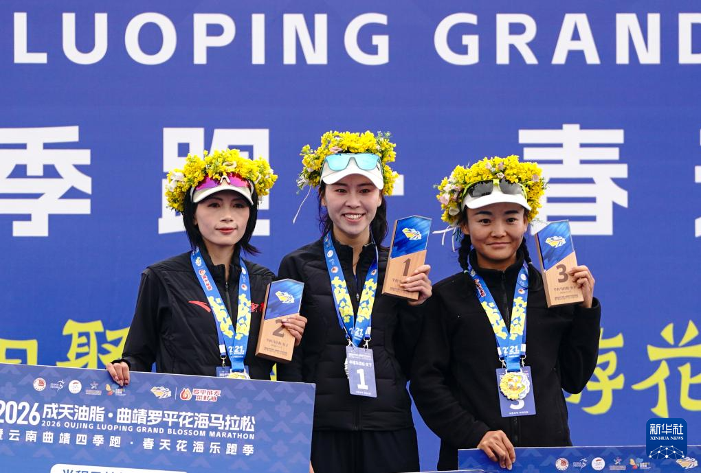 3月15日,分获女子半程马拉松前三名的张开琴(中)、李应美(左)、李晓吉在颁奖仪式上。