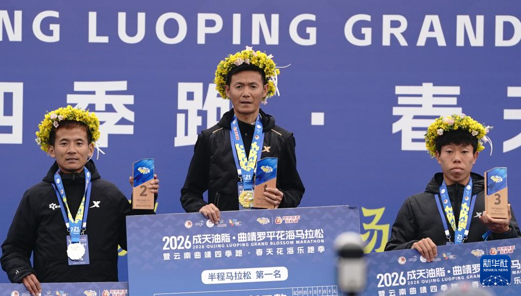 3月15日,分获男子半程马拉松前三名的包毕力格(中)、王涛(左)、冯铭缘在颁奖仪式上。