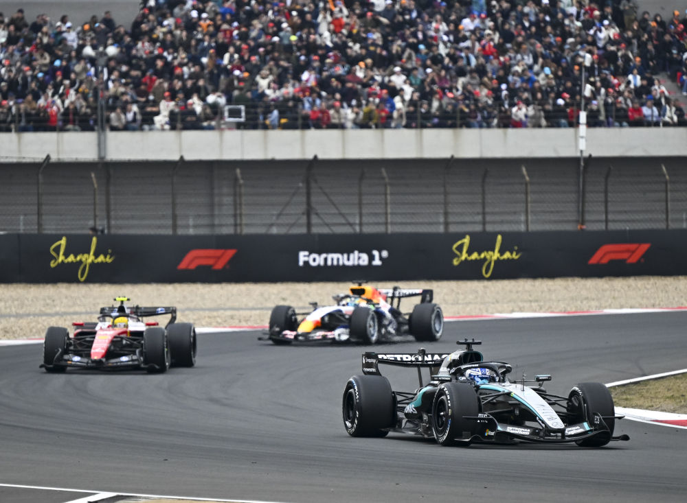 3月15日,梅赛德斯车队英国车手拉塞尔(前)在比赛中。新华社记者 陈浩明 摄
