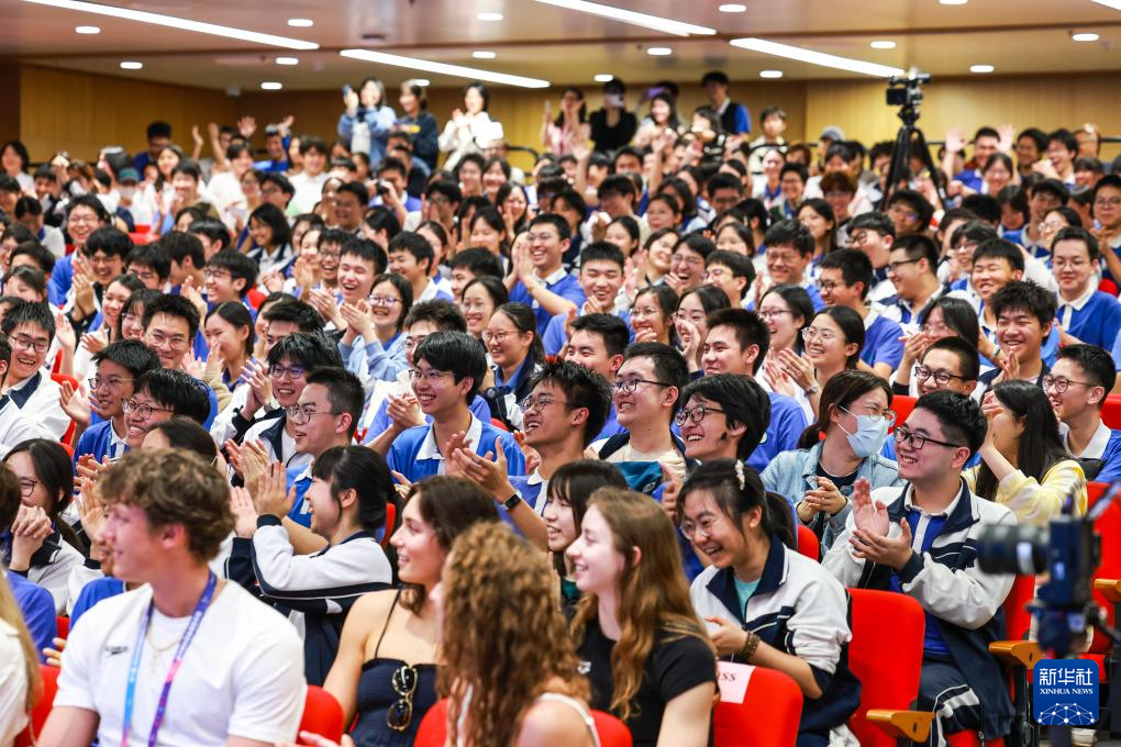 3月18日,中国游泳运动员潘展乐(中)在活动中回答学生提问。