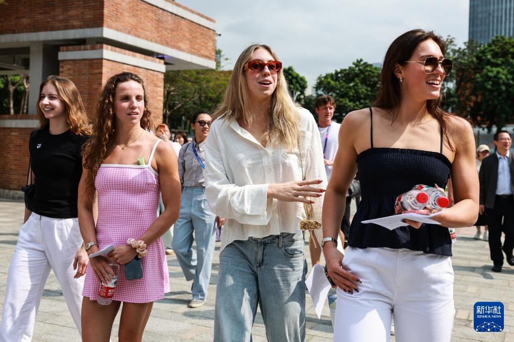 3月18日,美国游泳运动员亚历克斯·沃尔什(右一)、格蕾琴·沃尔什(右二)、瑞根·史密斯(左二)、凯特·道格拉斯参加校园公益活动。