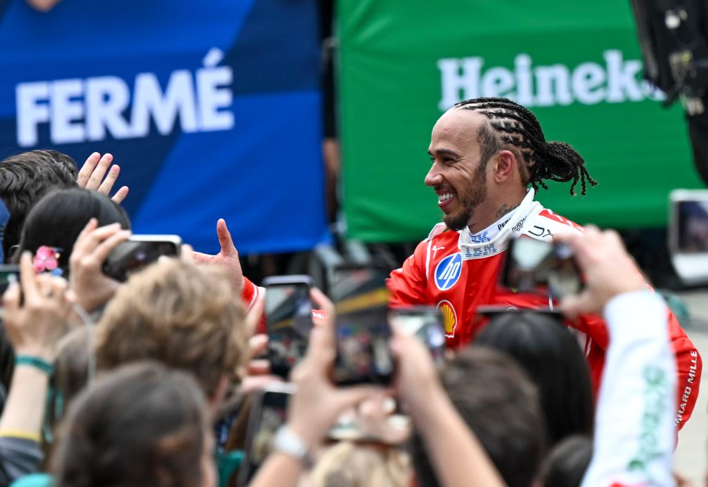 3月15日,法拉利车队英国车手汉密尔顿在比赛后与观众互动。新华社记者 陈浩明 摄