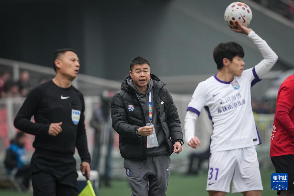 3月21日,天津津门虎队主教练于根伟(中)在比赛中。