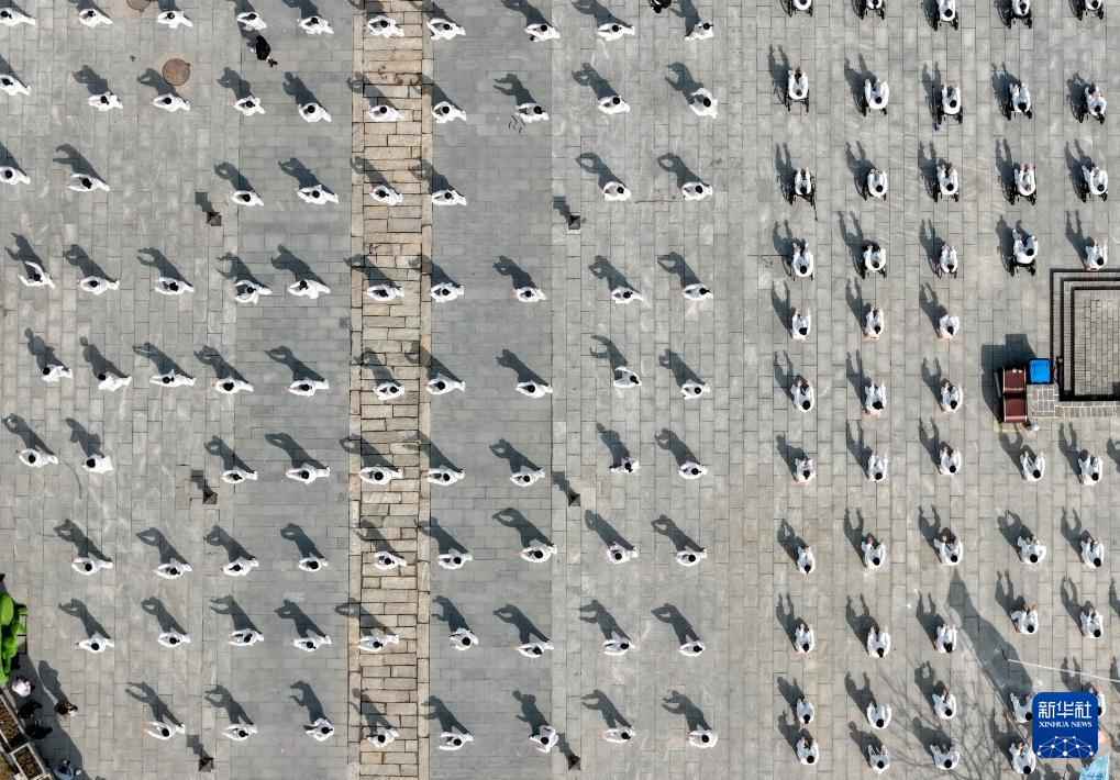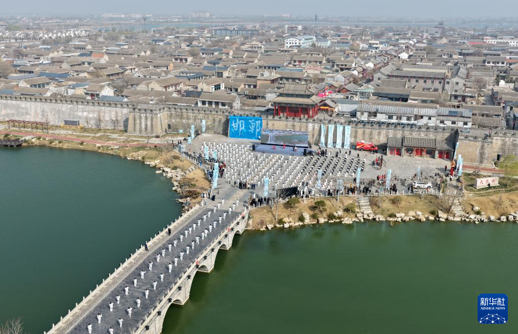 3月21日,太极拳爱好者在河北省邯郸市永年区广府古城进行太极拳展演(无人机照片)。