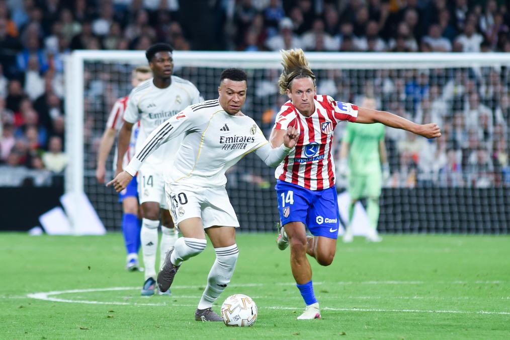 3月22日,皇家马德里队球员姆巴佩(左)与马德里竞技队球员略伦特在比赛中拼抢。新华社发(古斯塔沃·巴连特摄)