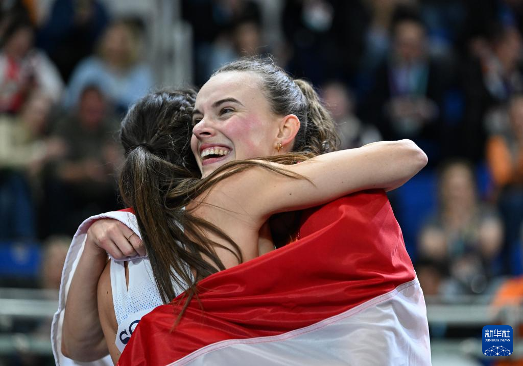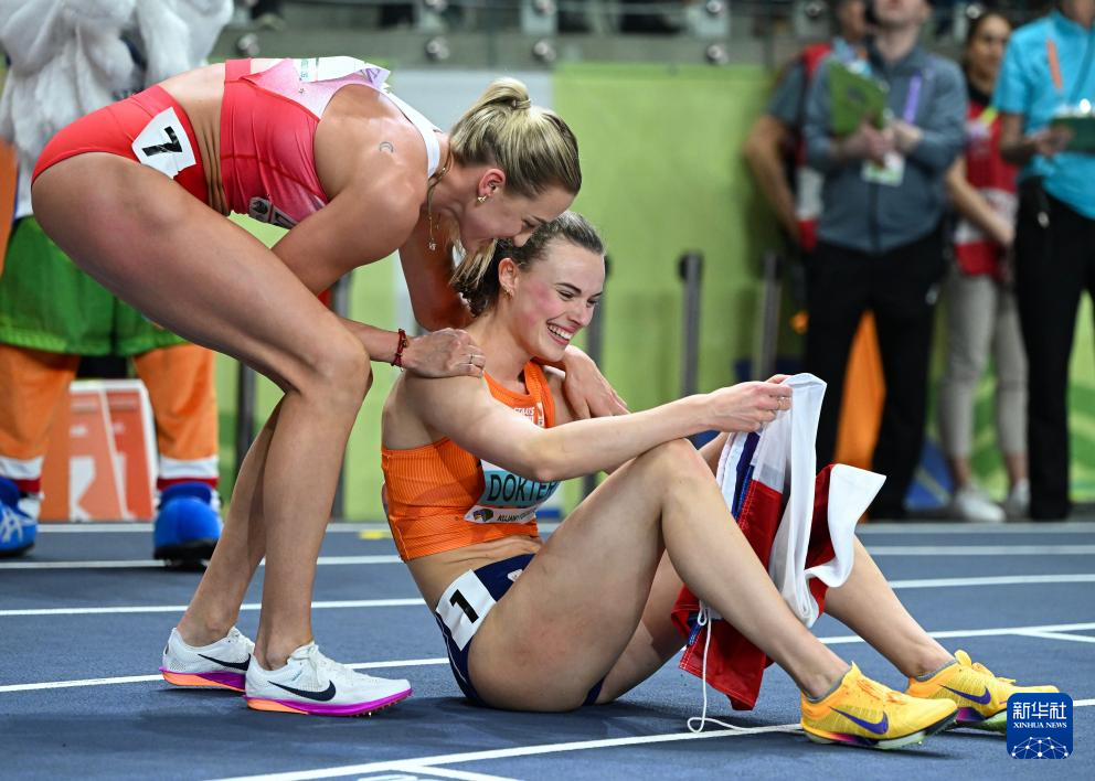 3月22日,荷兰选手多科特(右)在赛后庆祝。她以总分第一获得冠军。