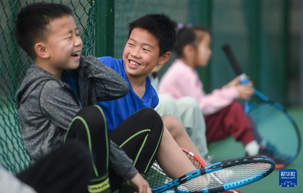 小朋友在湖北省京山市文峰公园网球场休息玩耍(2024年3月22日摄)。