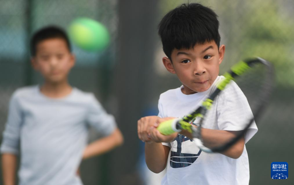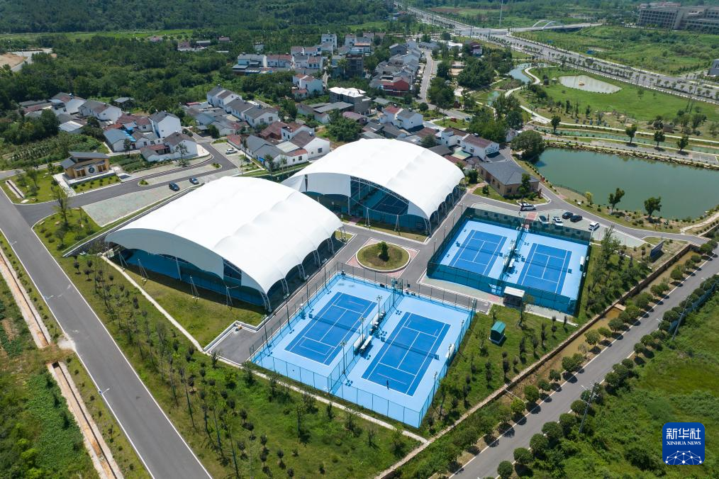 这是湖北省京山市文峰网球特色村网球训练场(2023年8月9日摄,无人机照片)。