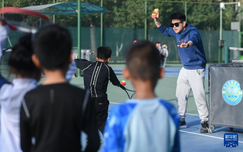 在湖北省京山市文峰公园网球场,教练指导孩子们打网球(2024年3月21日摄)。
