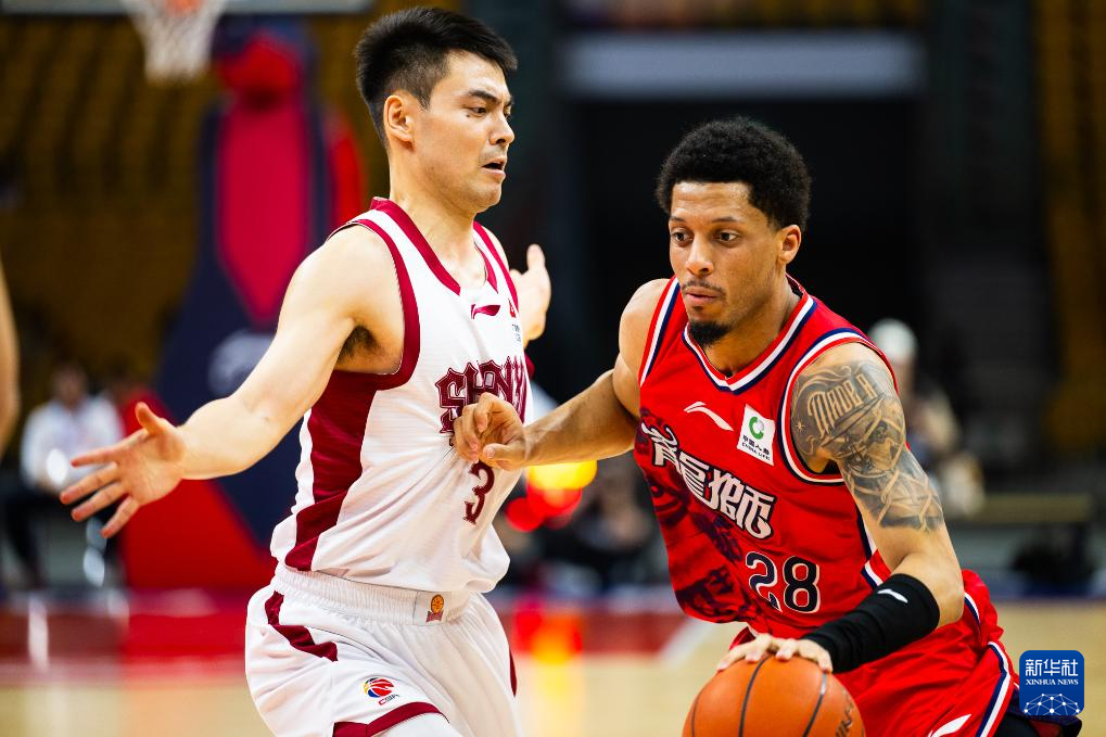 3月23日,广州朗肽海本队球员威金顿(右)在比赛中突破山西汾酒队球员奈特的防守。