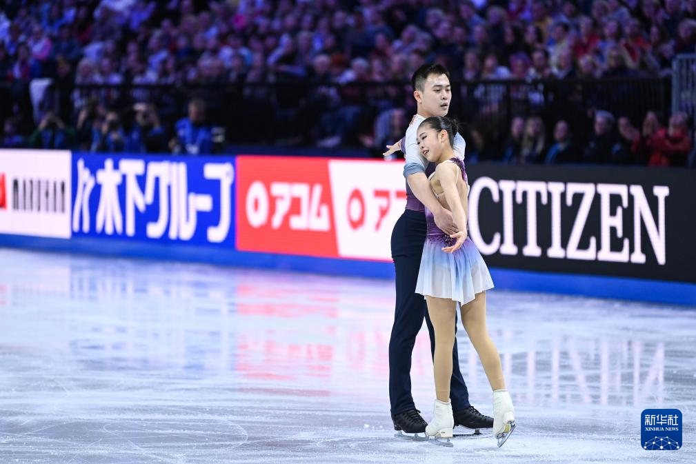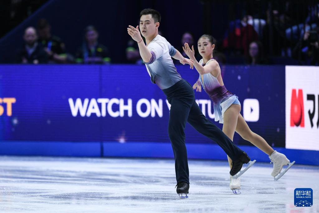 3月26日,中国组合张嘉轩(右)/黄一航在比赛中。最终,他们获得双人滑第九名。