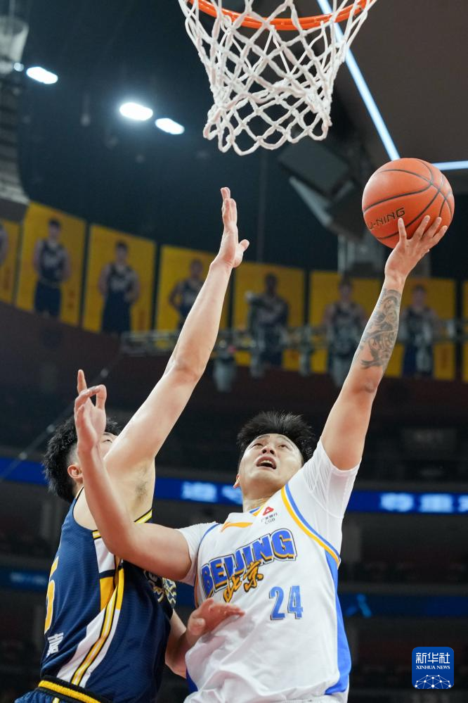 3月27日,北京北汽队球员赵睿(右)在比赛中上篮。
