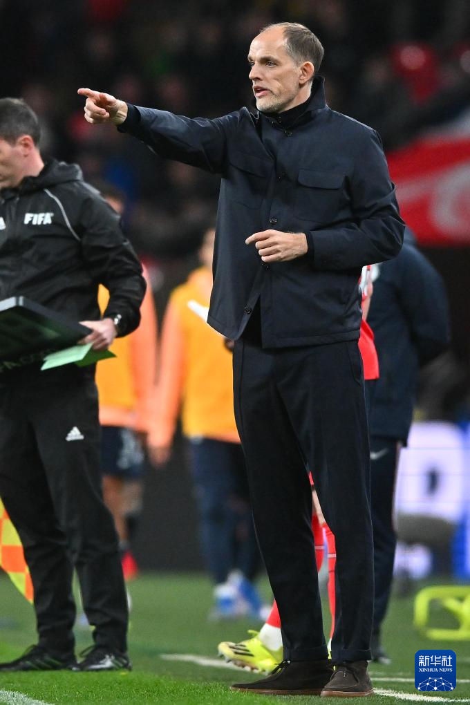 3月27日,英格兰队主教练图赫尔在场边指挥。