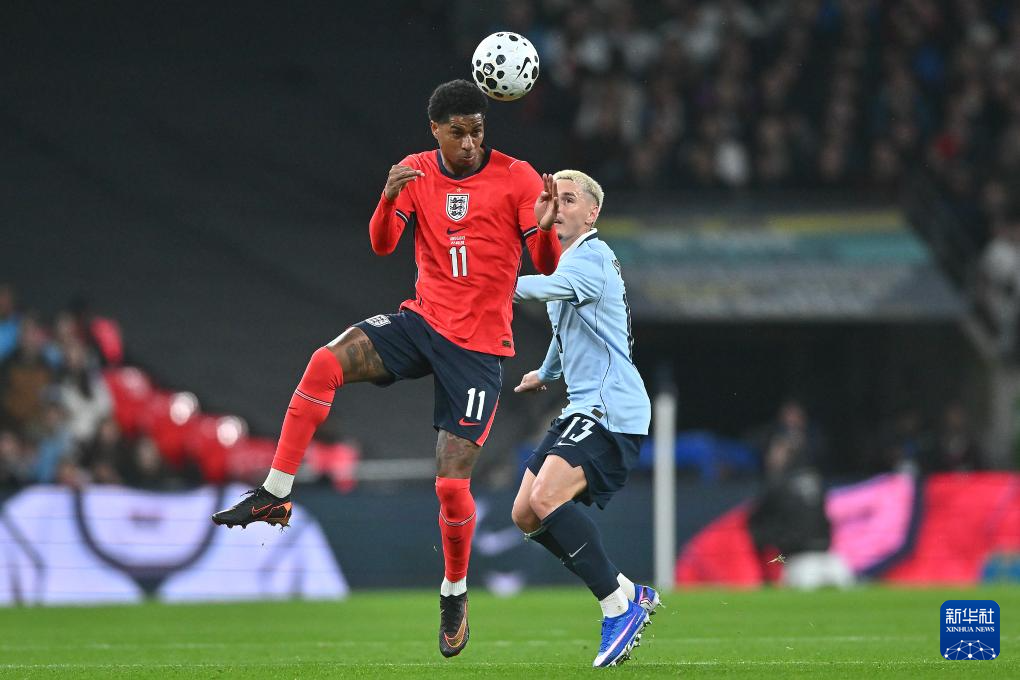 3月27日,英格兰队球员拉什福德(左)与乌拉圭队球员巴雷拉争顶。