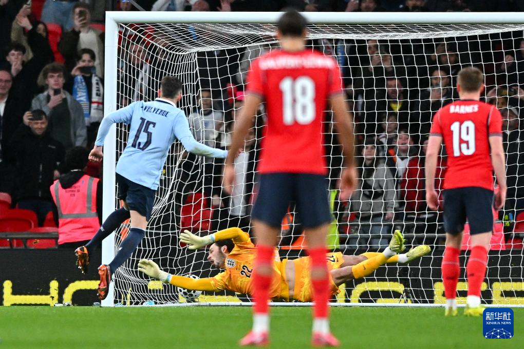 当地时间3月27日,在英国伦敦举行的一场国际足球友谊赛中,英格兰队主场1比1战平乌拉圭队。