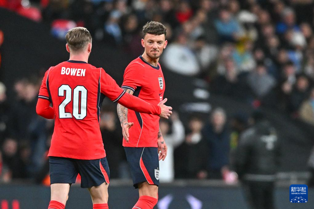 3月27日,英格兰队球员怀特(右)进球后与队友鲍恩庆祝。