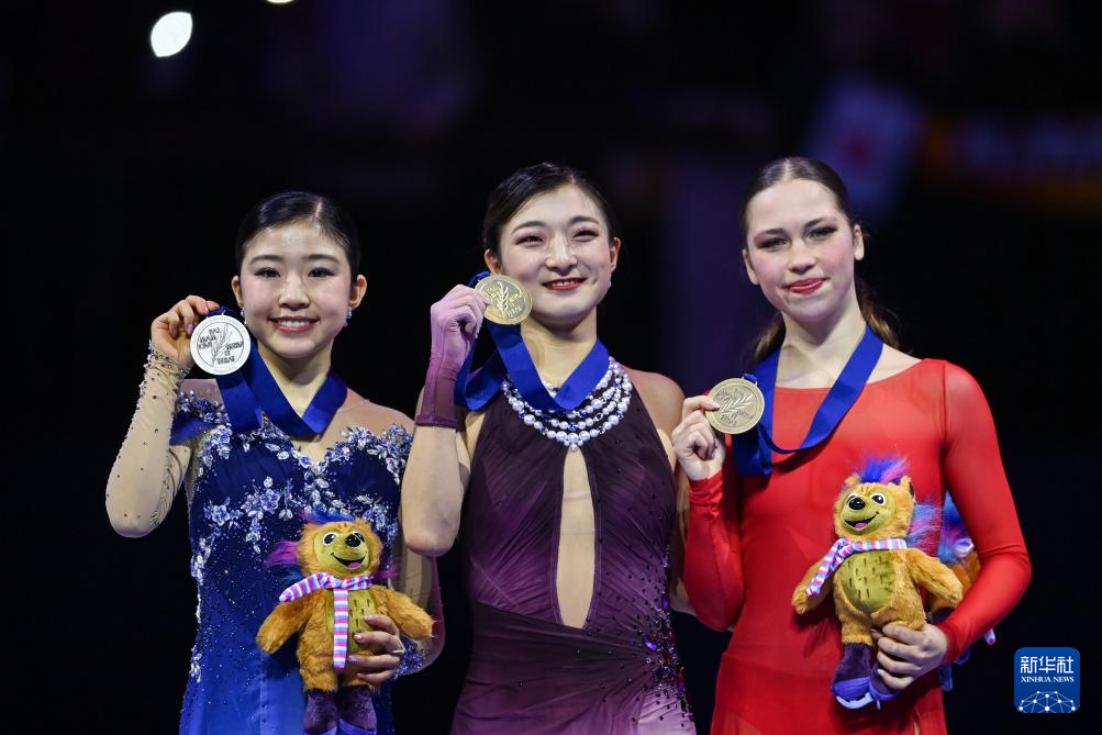3月27日,冠军日本选手坂本花织(中)、亚军日本选手千叶百音(左)、季军比利时选手尼娜·平扎罗内在女子单人滑项目颁奖仪式上。